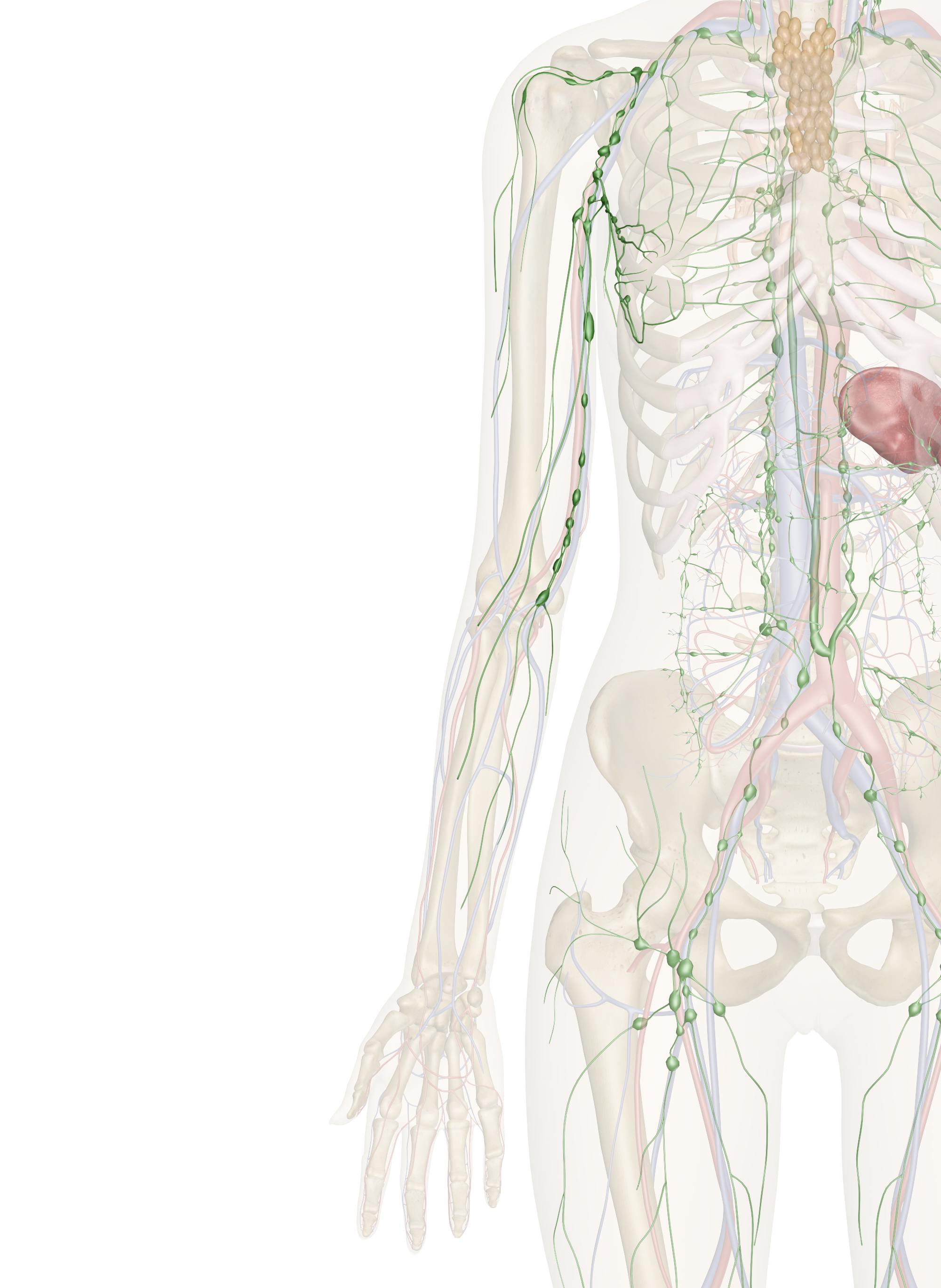 The primary structures of the lymphatic and immune systems in the upper extremities are the axillary nodes, which are located just under the armpit (some extend into the chest cavity as well) and the lymph vessels of the arm and hands, which move lymph throughout this region.