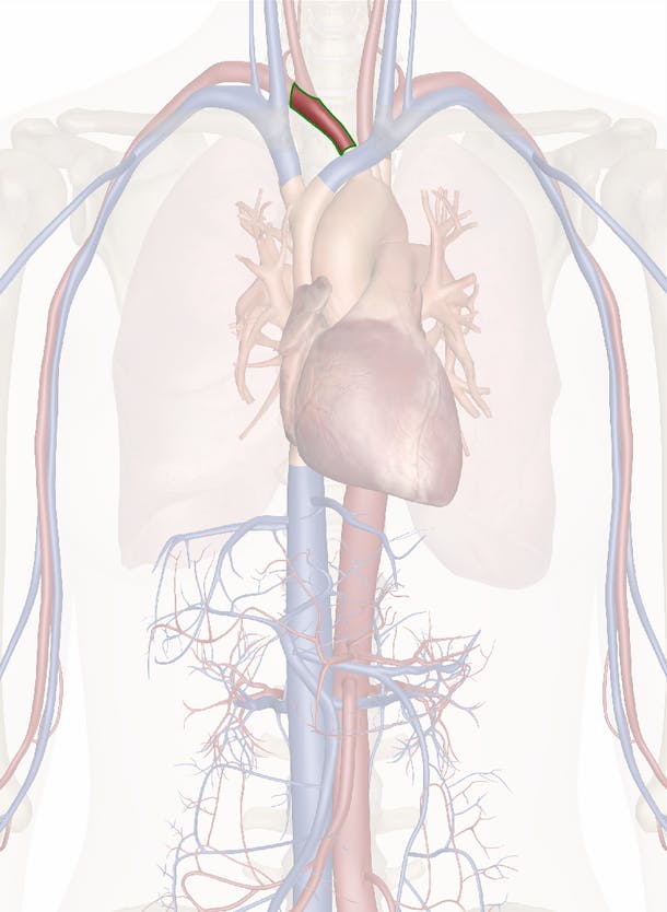 The brachiocephalic trunk is another word for the brachiocephalic artery. The brachiocephalic artery supplies blood to the tissues of the brain and the head. It is the first branch of the aortic arch and rises up to a point near the junction of the sternum (breast bone) and the right clavicle (collarbone). At this point, it divides, giving rise to the common carotid artery, which carries blood to the right side of the neck and head, and the right subclavian artery, which leads to the right arm.