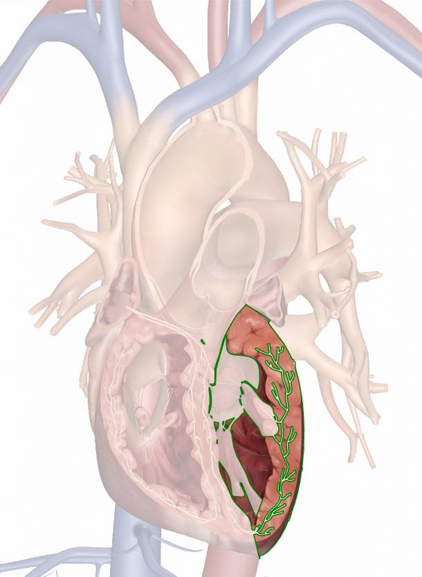 The human heart consists of four chambers: the left and right atrium and the left and right ventricle. Each chamber is a hollow cavity surrounded by a muscular wall. The left ventricle is the chamber on the lower left side of the heart, inferior to the left atrium.