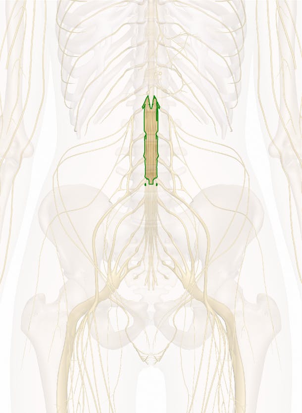 The cauda equina (literally, 'horse's tail' after its appearance) is the name given the collection of nerve fibers located at the end of the spinal column. The individual nerves in this part of the spinal cord exit the foramina within the vertebral bones of the spine nearly parallel with the spinal cord itself, unlike the nerves exiting the higher spinal vertebrae, which exit more nearly perpendicular to the central nerve bundle. This gives the cauda equina a collective appearance very much like how a horse's tail looks near to its body. The cauda equina can be found in the bottom third of the spinal canal and from the T12/L1 vertebrae to the coccyx, beyond the conus medullaris into the lumbar region. It consists of 9 to 11 pairs of spinal nerves (including the sciatic nerve) that communicate sensory and motor nerve messages between the central nervous system and the organs from the pelvis and throughout the lower limbs.