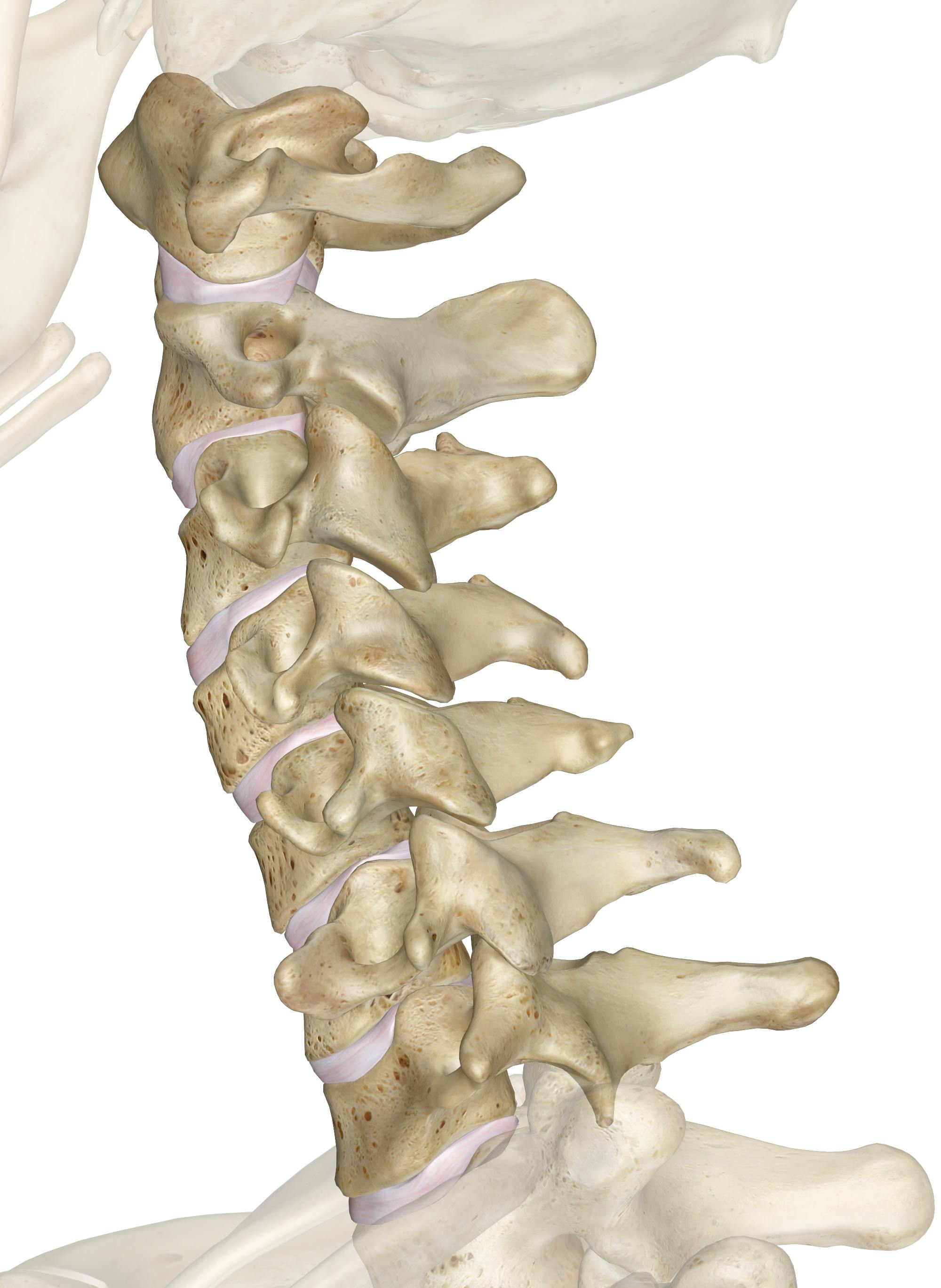 The cervical vertebrae of the spine consist of seven bony rings that reside in the neck between the base of the skull and the thoracic vertebrae in the trunk. Among the vertebrae of the spinal column, the cervical vertebrae are the thinnest and most delicate bones. Yet, in spite of their size, the cervical vertebrae have the huge jobs of supporting the head, protecting the spinal cord, and providing mobility to the head and neck.