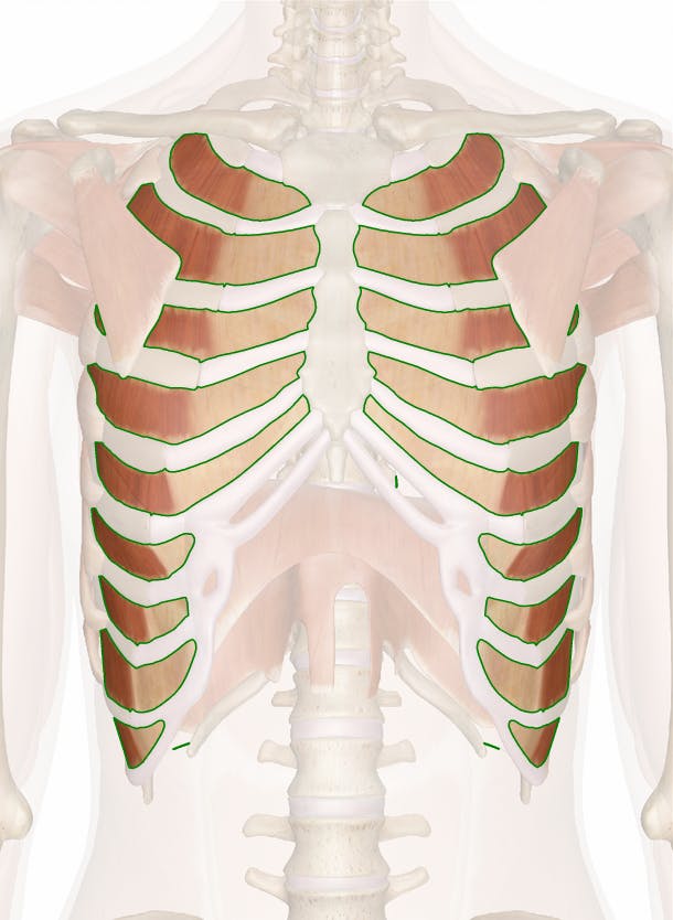 The 22 pairs of intercostal muscles are broken down into two groups: 11 pairs of internal intercostals and 11 pairs of external intercostals. Each rib is connected to the rib below it by both an external and internal intercostal muscle. The twelfth rib is the exception as it is the inferior-most rib.
