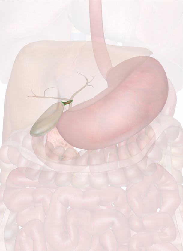 It has a spiral valve, which is a curved mucosal lining that is lined with deep folds. This valve doesn't offer much resistance to the flow of bile, which means that bile can flow pretty freely between the bile duct and the gallbladder. The gallbladder can therefore store bile between mealtimes, which is then released upon consumption of fatty foods, such as those containing high amounts of cholesterol. Unfortunately, this easy flow also means that gallstones can be released into the cystic duct and can block the bile flow. This blockage can lead to painful swelling of the gallbladder and sometimes requires surgery.