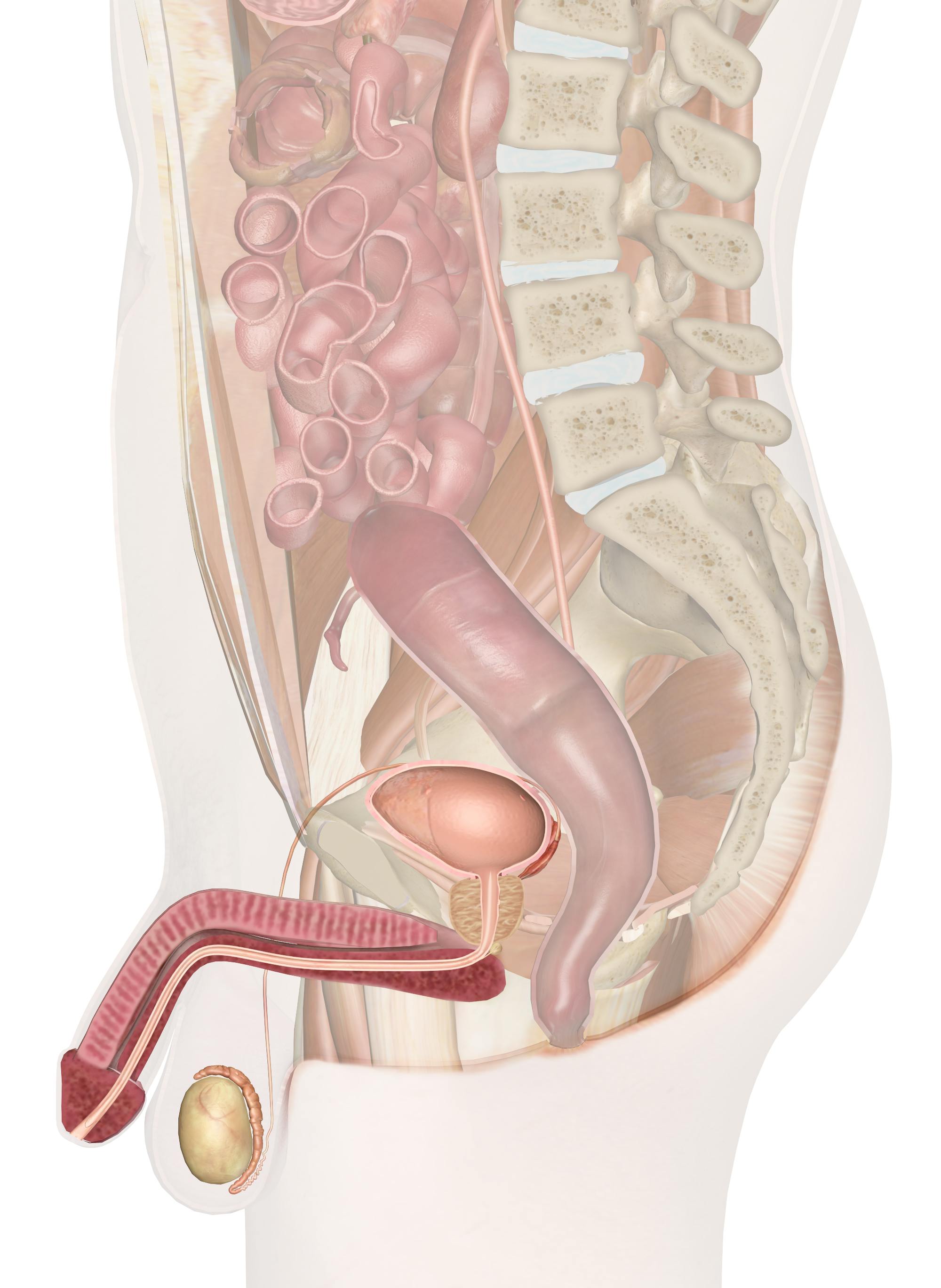 The ductus deferens carries sperm out of the scrotum and into the abdominopelvic cavity where it reaches the prostate. The prostate is a dense gland at the base of the urinary bladder. Roughly the size of a golf ball, it surrounds the urethra as the urethra exits the bladder. Along with the seminal vesicles, the ductus deferens from each testis meet at the prostate to form the ejaculatory duct. During ejaculation, sperm from the ductus deferens is mixed with the liquids produced by the prostate and seminal vesicles to form semen, which is then pushed by smooth muscle contraction into the urethra.