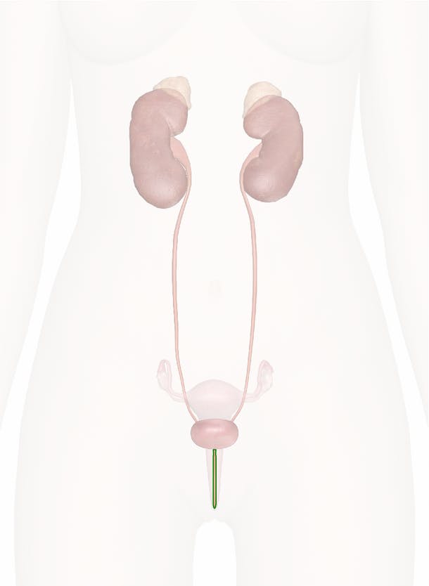 The urethra is a tube that conveys urine from the urinary bladder to the outside of the body. Its wall is lined with mucous membranes and contains a relatively thick layer of smooth muscle tissue. It also contains numerous mucous glands, called urethral glands that secrete mucus into the urethral canal. In females the urethra is about 4 cm long. It passes forward from the bladder, descends below the symphysis pubis, and empties into the labia minor. Its opening is located above the vaginal opening and about 2.5 cm below the clitoris. In males, the urethra functions both as a urinary canal and a passageway for cells and secretions from various reproductive organs. It can be divided into three sections: the prostatic urethra, the membranous urethra, and the penile urethra.