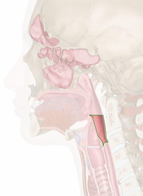 The laryngopharynx is where both food and air pass. It can be found between the hyoid bone and the larynx and esophagus, which helps guide food and air where to go. It is a part of the pharynx. A smooth mucous membrane covers the side and back walls. At the back of the larynx, the anterior wall of the laryngopharynx exists.