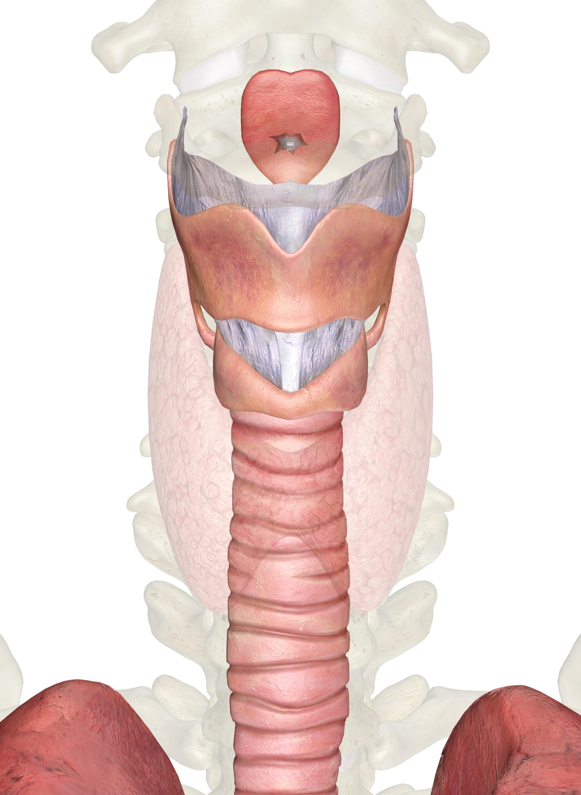The larynx is a tough, flexible segment of the respiratory tract connecting the pharynx to the trachea in the neck. It plays a vital role in the respiratory tract by allowing air to pass through it while keeping food and drink from blocking the airway. The larynx is also the body's "voice box" as it contains the vocal folds that produce the sounds of speech and singing.