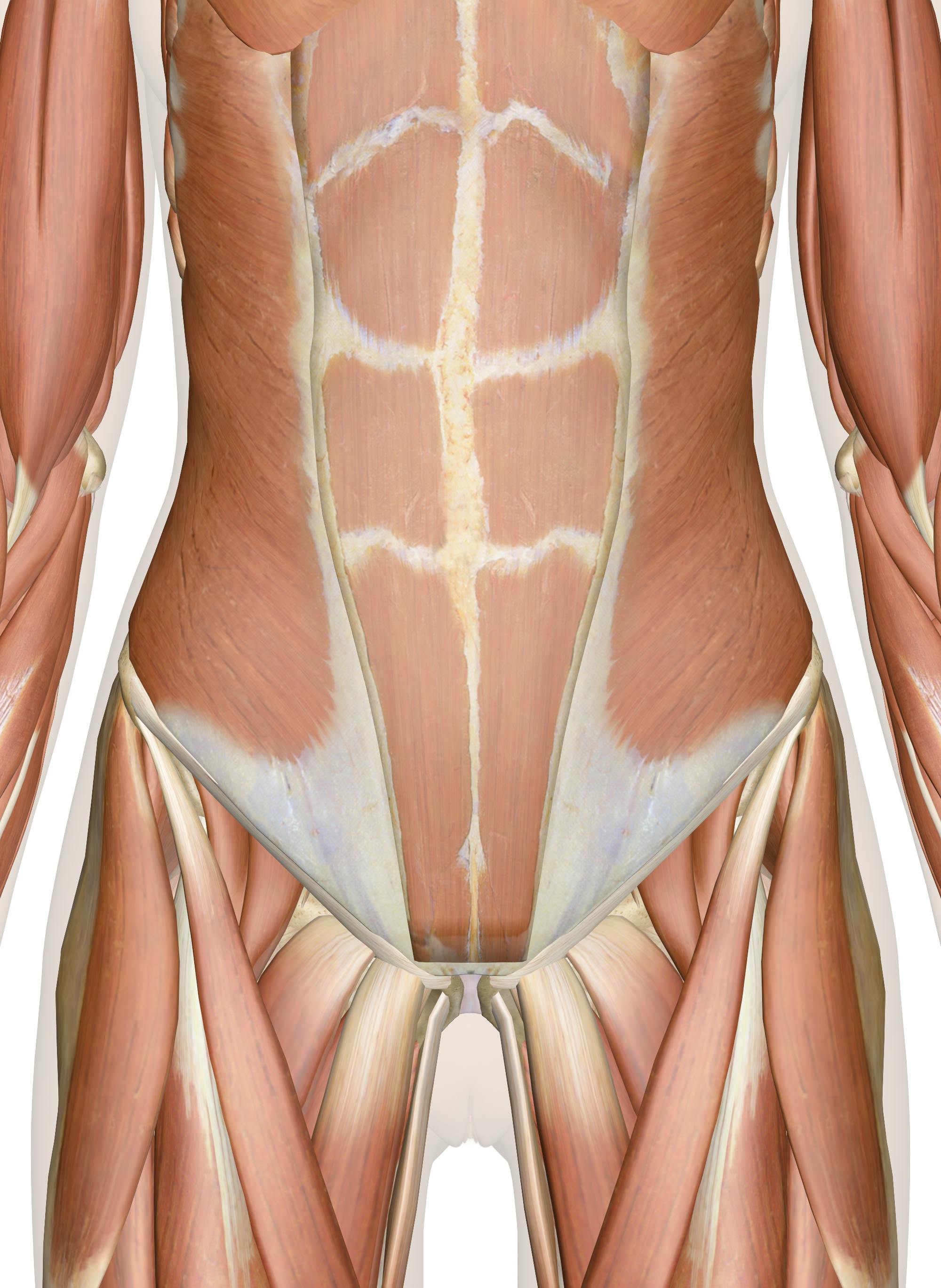 Extending across the anterior surface of the body from the superior border of the pelvis to the inferior border of the ribcage are the muscles of the abdominal wall, including the transverse and rectus abdominis and the internal and external obliques. Working as a team, these muscles contract to flex, laterally bend, and rotate the torso. The abdominal muscles also play a major role in the posture and stability to the body and compress the organs of the abdominal cavity during various activities such as breathing and defecation.