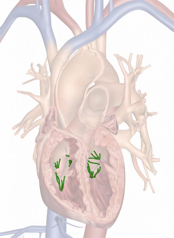 The chordae tendineae are a group of string-like tendinous bands found within both ventricles of the heart. They arise from the tips of the papillary muscles on the inside of the wall of the ventricles and extend into the hollow lumen. Most separate into two or more branches, but some resemble simple, unbranched strings. On their far end, the chordae tendineae merge with and insert on the cusps of the atrioventricular (AV) valves. In the right ventricle, the chordae tendineae connect to the three cusps of the tricuspid valve, while in the left ventricle they connect to the two cusps of the bicuspid (or mitral) valve.