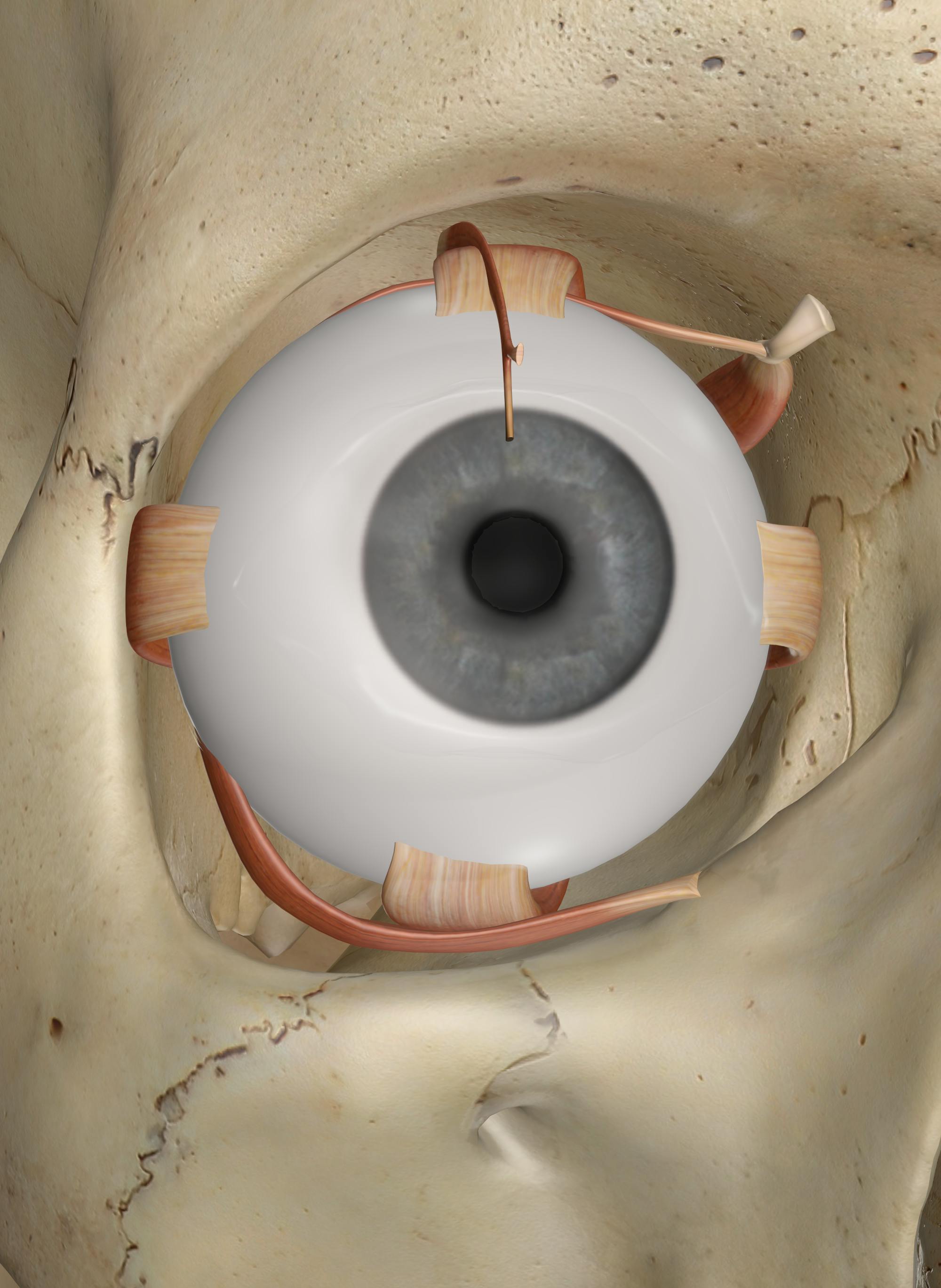 The superior rectus muscle forms its origin on the annulus of Zinn and inserts along the superior edge of the eye. It is a thin muscle and forms a straight muscular band between the eye and the annulus of Zinn. The inferior, medial, and lateral rectus muscles are almost identical to the superior rectus muscle, except they insert on the inferior, medial, and lateral edges, respectively, of the eye.