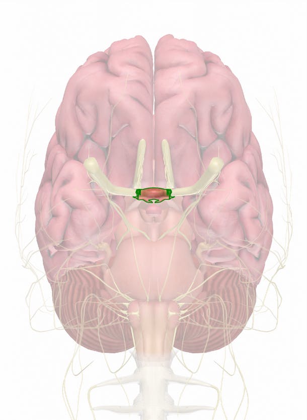 The optic chiasm or optic chiasma is an X-shaped space just in front of the pituitary gland where optic nerve fibers pass through to the brain. The fibers from the nasal half of each retina cross over, but those from the temporal sides do not. Specifically, fibers from the nasal half of the left eye and the temporal half of the right eye form the right optic tract; and the fibers from the nasal half of the right eye and the temporal half of the left form the left optic tract. The nerve fibers then continue in the optic tracts.