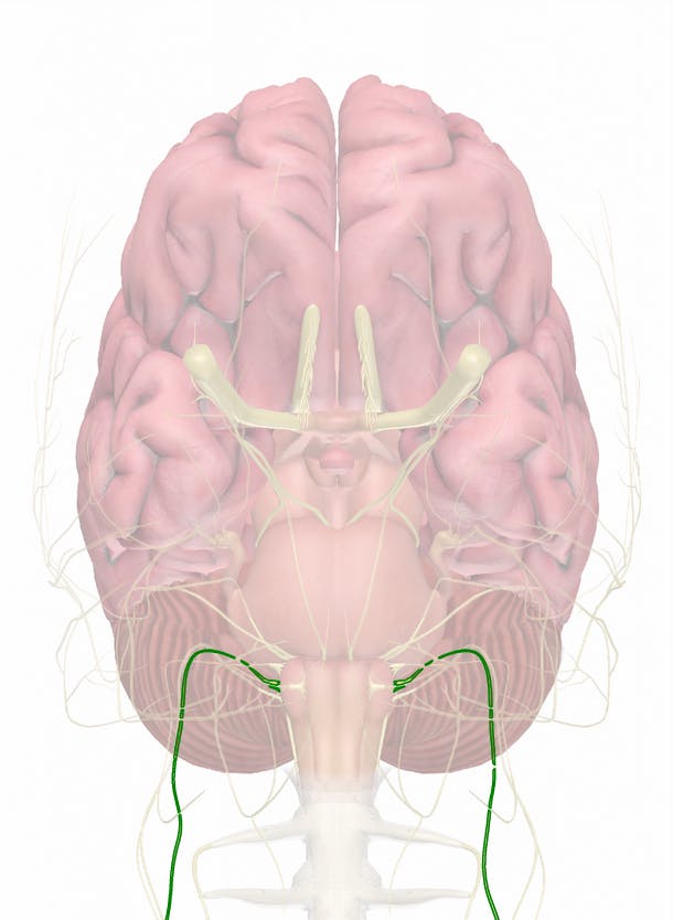 The vagus nerve, identified as cranial nerve X, originates in the area between the pons at the base of the brain stem and the spinal column, and extends down through the neck into the chest and abdomen. The vagus nerve includes both sensory and motor nerves and, although they contain both voluntary and involuntary branches, the involuntary members predominate. The voluntary components are motor fibers that carry impulses to muscles in the larynx to aid in speech and swallowing. Other sensory fibers carry impulses from the lining of the larynx, pharynx, esophagus, thorax and abdomen to the brain. The involuntary motor fibers supply the heart and several of the smooth muscles and glands in the organs of the thorax and abdomen. Since these nerves are the tenth pair of cranial nerves, they are numbered X.