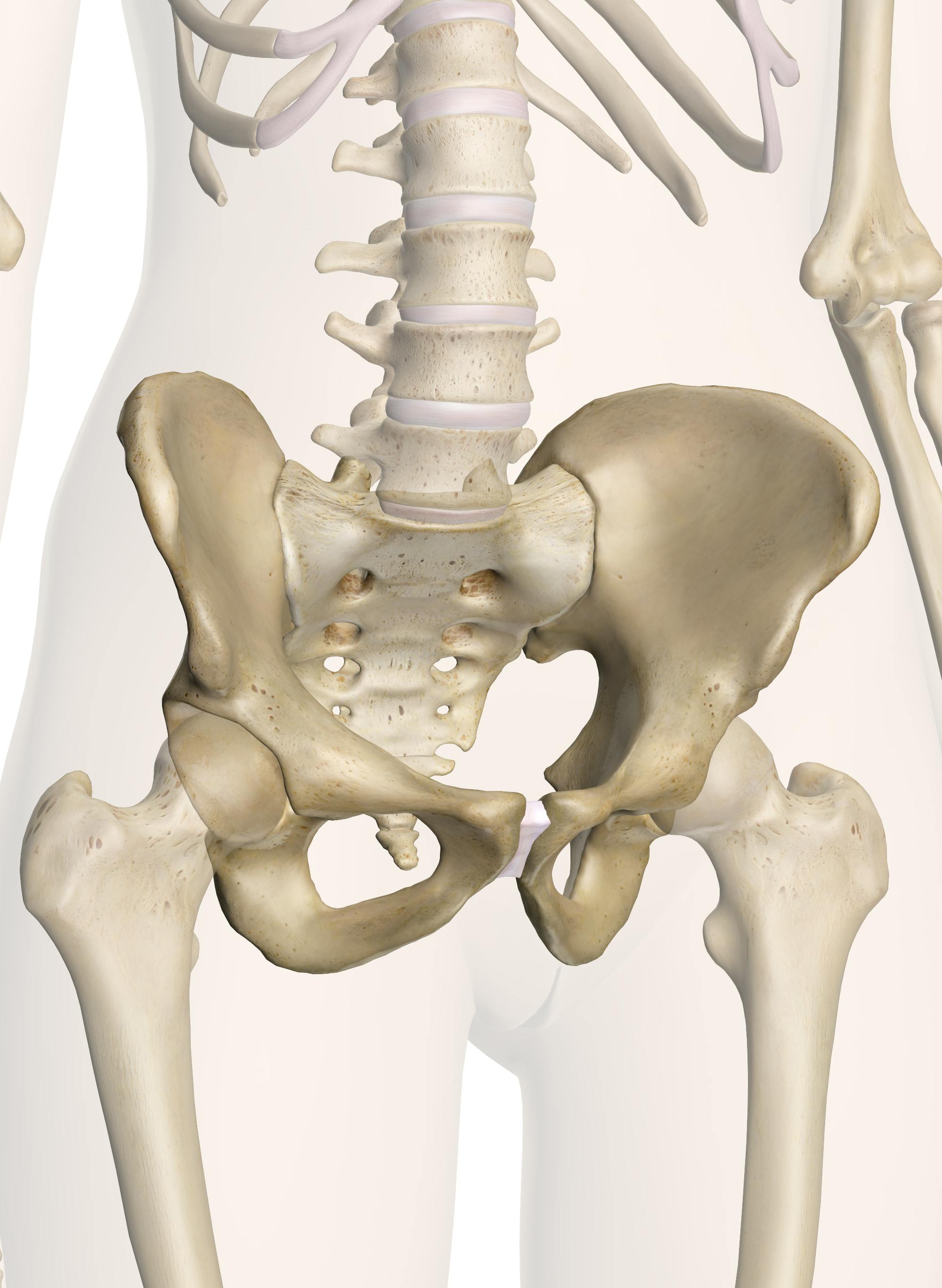 Throughout childhood, the pelvis is made of many smaller bones that eventually fuse during adulthood to form a more rigid pelvis. Each of the coxal bones begins as three separate bones: the ilium, ischium, and pubis. The ilium is the largest, widest, and most superior of the hip bones. When you place your hands on your hips, you can feel the curved ridge of the ilium known as the iliac crest. The narrow ischium is inferior to the ilium and is the bone, along with the coccyx, that you rest your body weight on while sitting. Anterior to the ischium is the pubis, the smallest of the hip bones. The ilium, ischium, and pubis meet in the center of the hip bone to form the deep, cup-like socket of the hip joint called the acetabulum.