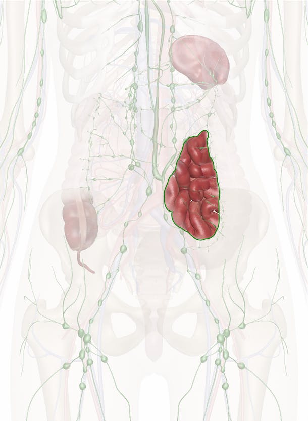 Peyer's patches are small masses of lymphatic tissue found throughout the ileum region of the small intestine. Also known as aggregated lymphoid nodules, they form an important part of the immune system by monitoring intestinal bacteria populations and preventing the growth of pathogenic bacteria in the intestines.