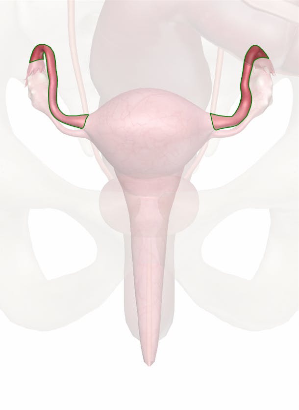 The Fallopian tubes are located in the pelvic cavity extending laterally from the corners of the superior edge of the uterus and passing superior to the ovaries. The broad ligament of the uterus and suspensory ligaments support the Fallopian tubes and hold them in place relative to the uterus and ovaries. Each Fallopian tube begins as a very narrow tube at the uterus and gradually widens as it extends towards the ovary. The isthmus of the Fallopian tubes is the narrowest and thickest walled region of the fallopian tube bordering on the uterus. From the isthmus the Fallopian tube widens into the ampulla, which makes up the bulk of its length. Finally, the Fallopian tube widens greatly into the funnel-shaped infundibulum before ending superior and lateral to the ovary. Many finger-like projections known as fimbriae extend from the infundibulum to reach the surface of the ovary.