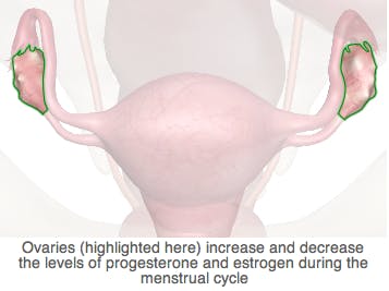 The ovaries play two central roles in the female reproductive system by acting as both glands and gonads. Acting as glands, the ovaries produce several female sex hormones including estrogens and progesterone. Estrogen controls the development of the mammary glands and uterus during puberty and stimulates the development of the uterine lining during the menstrual cycle. Progesterone acts on the uterus during pregnancy to allow the embryo to implant and develop in the womb.
