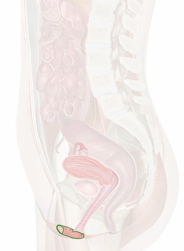 Unlike the surrounding mons pubis and labia majora, the labia minora are covered with hairless skin and contain very little adipose tissue. At their anterior end they meet at the clitoral hood, or prepuce, where they surround the lateral sides of the clitoris. From the clitoral hood, the labia minora extend inferiorly toward the anus, where they gradually decrease in size before merging with the skin of the perineum. The middle region of the labia minora covers and protects the urethral orifice and vaginal orifice from the exterior environment.