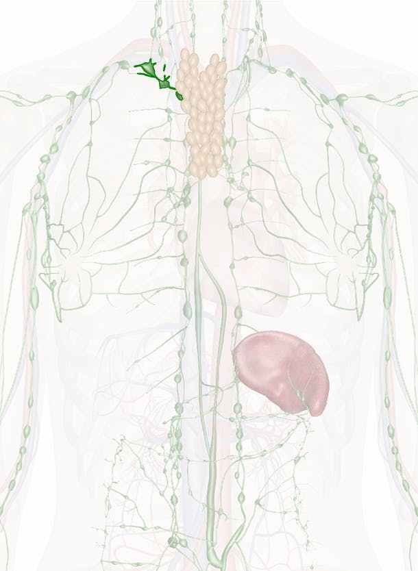The right lymphatic duct, also called the right thoracic duct, is about 1.25 cm long. It drains lymphatic fluid from the right thoracic cavity (this is the section of the trunk on the upper right side), the right arm, and from the right side of the neck and the head. In some people, it also drains lymph from the left lung's lower lobe. This duct is located near the base of the neck, and goes along the medial border of the anterior scalene muscle at the side of the neck. In most individuals, it ends at the right subclavian vein.
