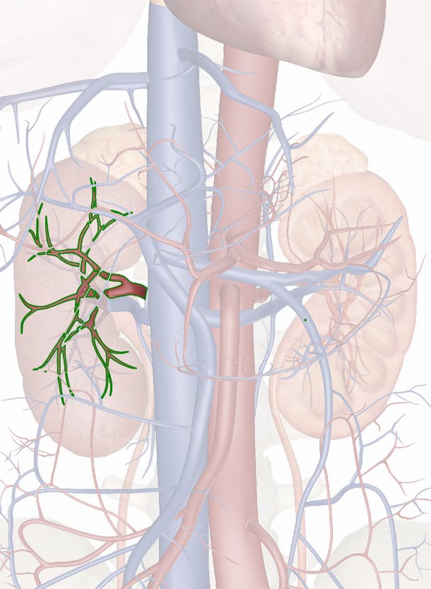 The right renal artery is longer than the left renal artery. It passes laterally from the abdominal aorta into the right kidney. It then divides into several smaller branches within the kidney tissues.