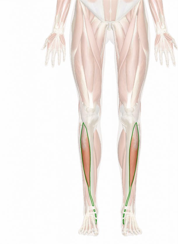 The tibialis anterior muscle is a long, narrow muscle in the anterior compartment of the lower leg. Arising from origins along the lateral condyle and proximal body of the tibia, it runs down the shin just lateral to the tibia. Just above the ankle, the muscular body of the tibialis anterior ends and its long tendon extends across the medial side of the ankle and into the foot. In the foot, the tendon forms insertions on the first metatarsal and first cuneiform bones.