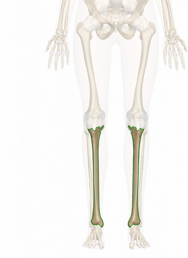 The tibia, sometimes known as the shin bone, is the larger and stronger of the two lower leg bones. It forms the knee joint with the femur and the ankle joint with the fibula and tarsus. Many powerful muscles that move the foot and lower leg are anchored to the tibia. The support and movement of the tibia is essential to many activities performed by the legs, including standing, walking, running, jumping and supporting the body's weight.