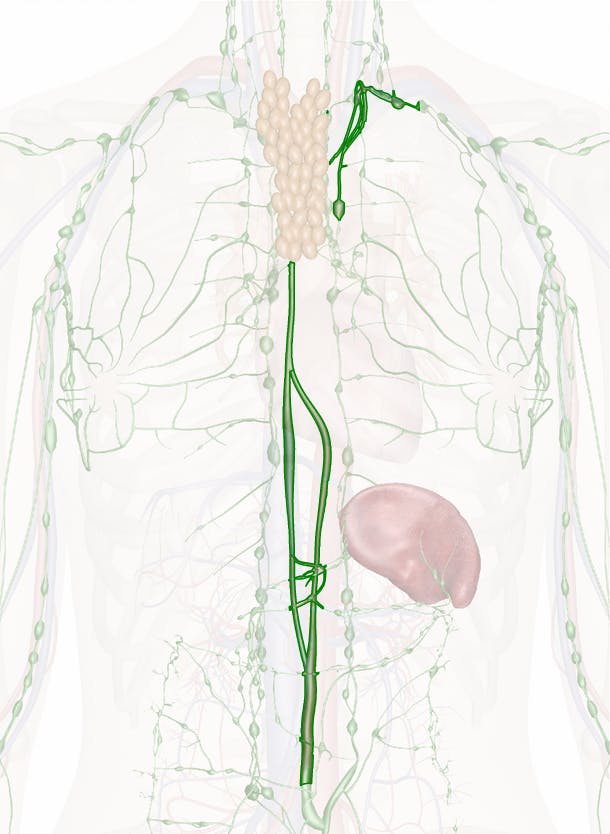 The thoracic duct, or the left lymphatic duct, is the largest of the body's lymphatic ducts. It collects almost all of the lymph that circulates throughout the body (the remainder is collected by the right thoracic duct); from there, the lymph flows back into the bloodstream. The thoracic duct is a structure roughly sixteen inches long located in the mediastinum of the pleural cavity which drains lymph fluid from everywhere except the upper right quarter of the body above the diaphragm and down the midline (this is collected by the right lymphatic duct).